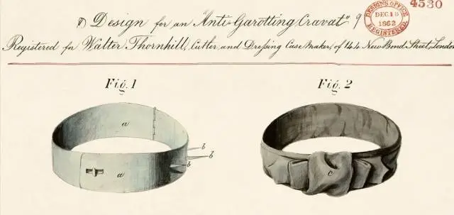 维多利亚时期的刑罚相对成熟及严谨。这只颈圈设计出来的目的是取代绞刑的残忍,而是将一个设有开关控制颈圈的伸缩,同时可以佩戴在衣领圈下部,让犯人可以“优雅”地死去。