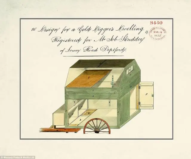 这是一辆拖拉式的小车,当然,在前面“驾驶”的主要是马匹(虽然同时期汽车发明也开始极少地出现)。发明者专门为当时的淘金者们设计,内部构造一应俱全,哪里可以放工具、存储金子,还有可以睡觉的地方。