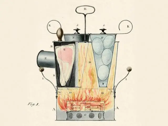 这可以说是一个微波炉的雏形,从蒸鸡蛋到烤肉片,可以在同时间完成。原理就像图上展示的一样,总体部分烧火,用于煮的、烤的几个容器分别置于这个大锅之中。每个容器的手柄也被仔细设计。