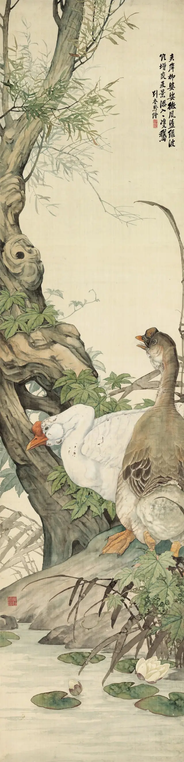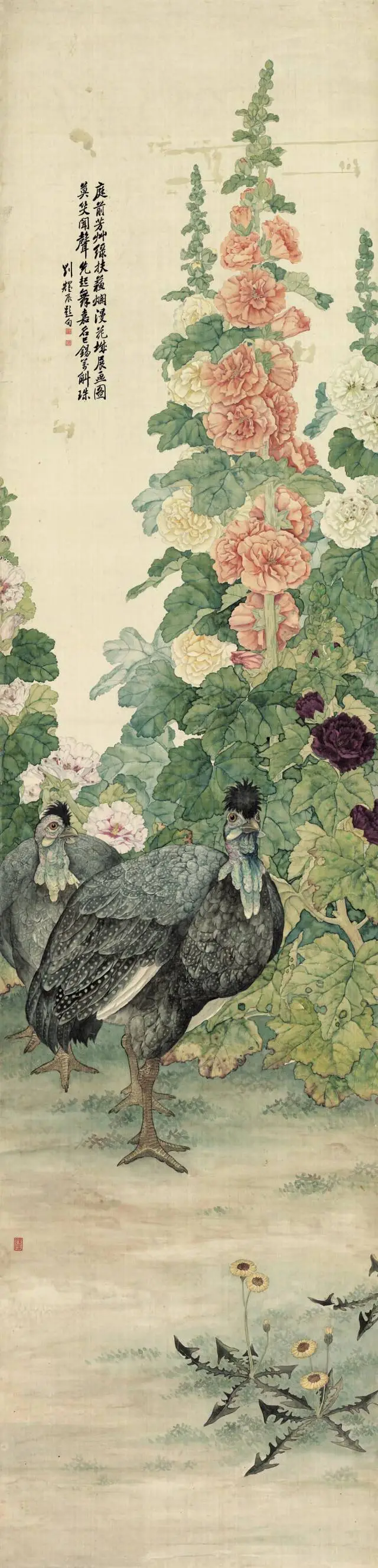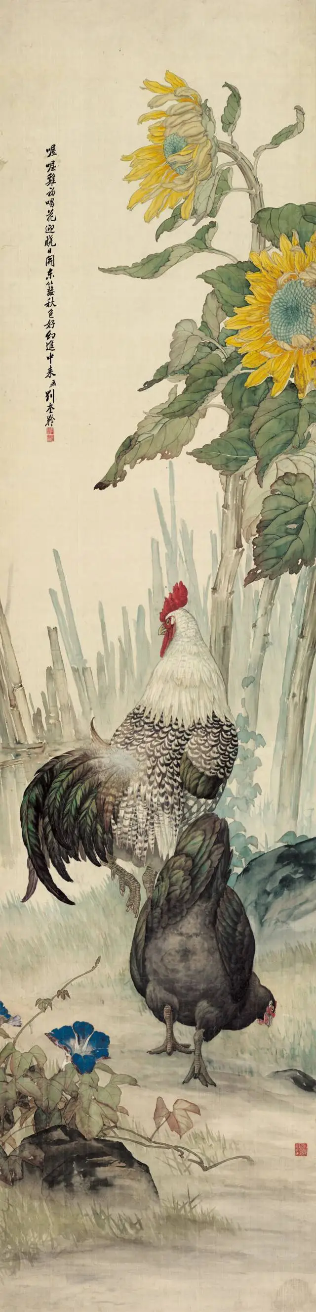 刘奎龄(1885─1967),字耀辰,号蝶隐,自署种墨草庐主人。中国近现代美术史开派巨匠,动物画一代宗师,被誉为“全能画家”,能工善写,擅长动物、植物、人物画及山水画,他描摹的动物种类之多,范围之广至今无人可追;他善于“势”的营造,绘画作品“虚处不嫌窗框松,实处勿感板结紧”,其画风华滋清润,厚劲灵动,意境深邃。刘奎龄偏居津门一隅,语讷志坚,孤身前行,其创作恰与徐悲鸿的“尽精微,致广大”契合。他钟情于日本绘画,关注横山大观和竹内西凤等代表性人物, 学习借鉴朦胧派、狩野派、大和绘、汉画等古典技法精粹。他是传统派和中西融合派的中坚,他从古典主义、文艺复兴、浪漫主义、现实主义甚至印象派光色运用、油画技术以至夸张变形中吸取营养,他注意到西方现代艺术与中国传统艺术在创造精神上的相似性,他光大了传统写实技法,其艺术风格影响了惠孝同、刘子久、陈少梅、刘继卣、何家英等北派艺术家。其代表作《上林春色图》深得徐悲鸿高度赞扬,并被其赞誉为“当代中国画坛翎毛第一人”。